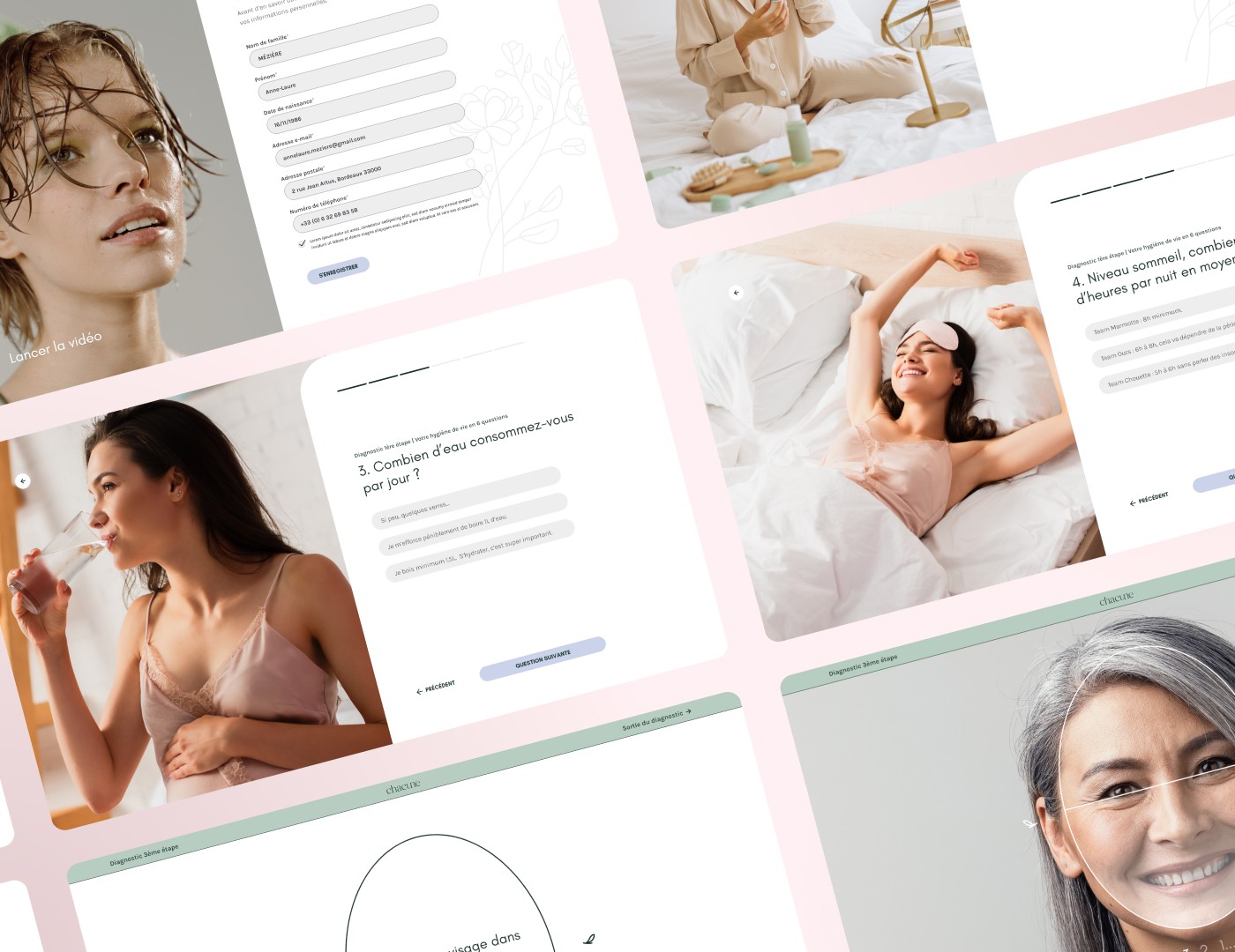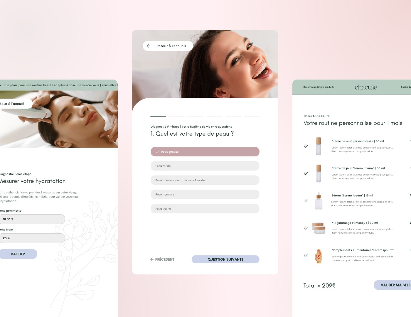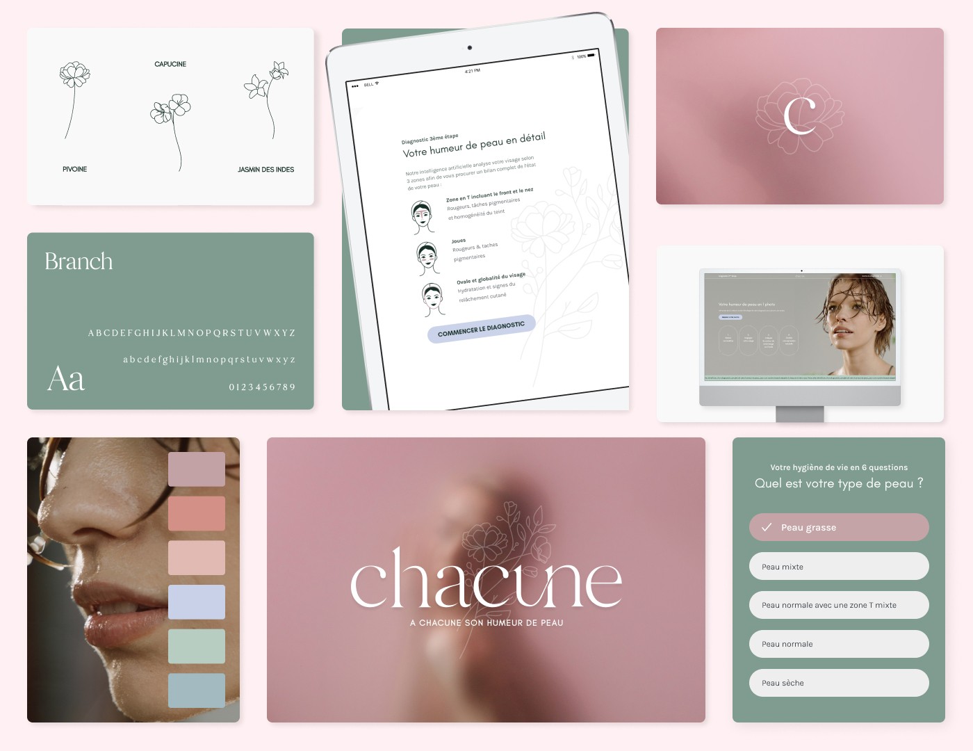 Dans ce projet, j’ai conçu l’identité visuelle complète et les maquettes de l’application de diagnostic de peau pour Chacune, une marque qui adapte ses soins aux besoins spécifiques de chaque peau. Le logo, inspiré d’un bouquet floral, symbolise les principes actifs naturels des produits. La palette de couleurs et les pictogrammes ont été pensés pour refléter l’aspect féminin, poétique et naturel de la marque. L’application allie esthétique épurée et ergonomique, pour accompagner les clientes dans une routine beauté sur mesure