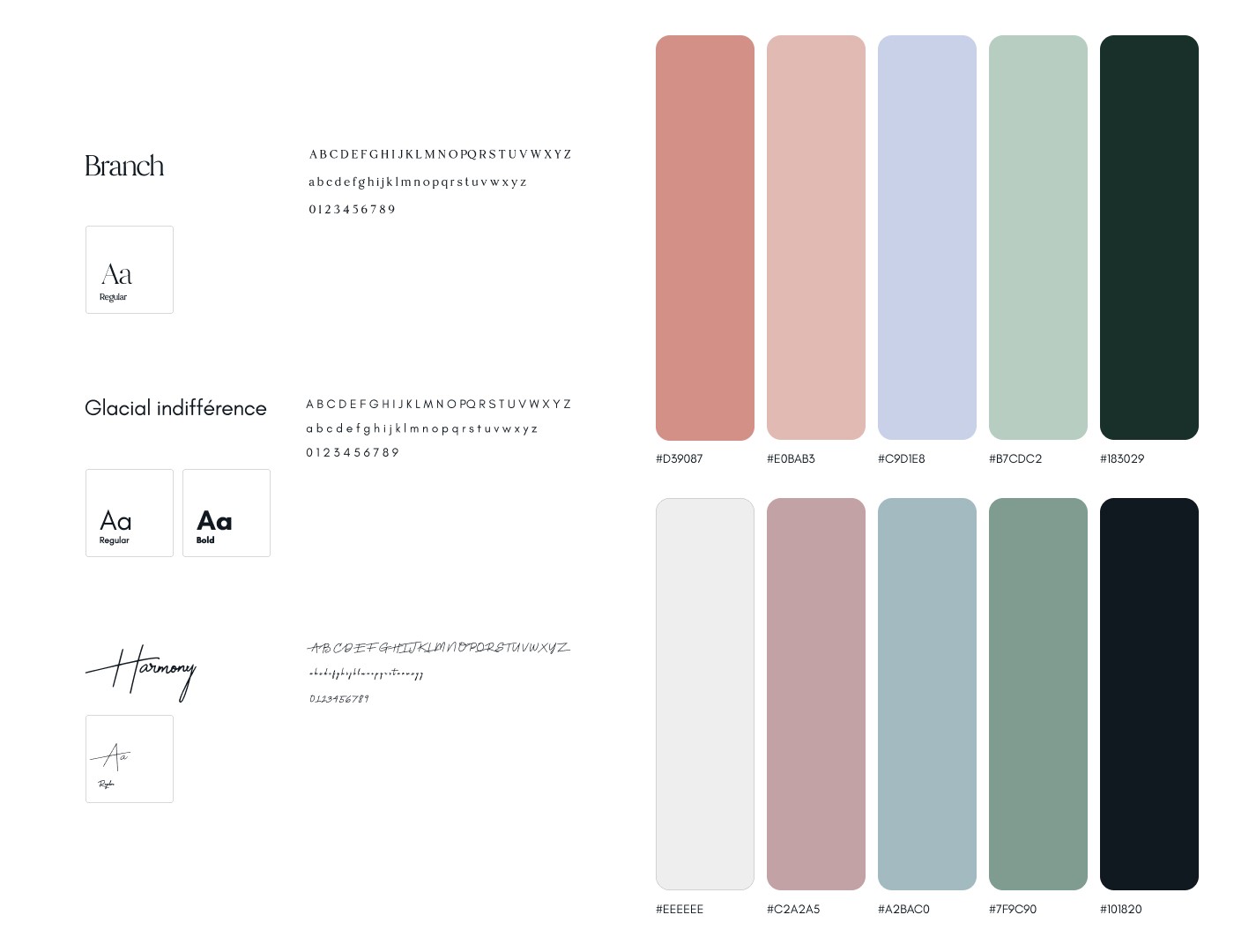 logo et déclinaisons, palette couleurs, typographies, 12 pictogrammes, maquettes responsive
