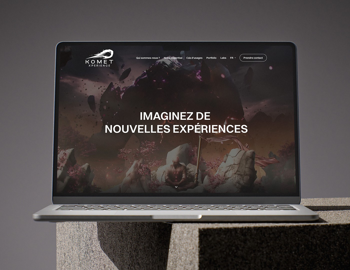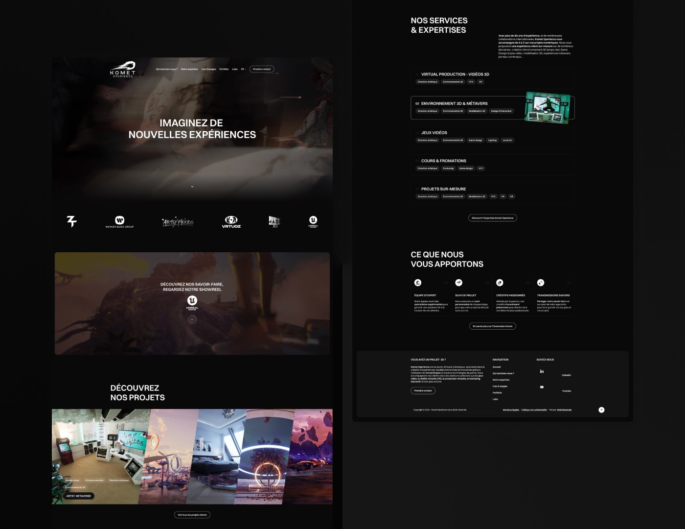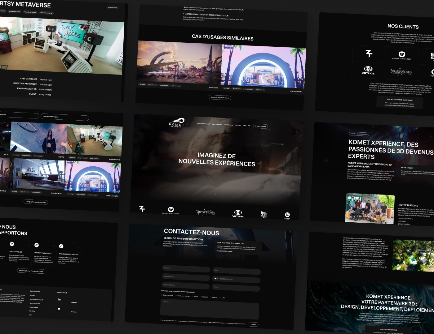 L’agence WebtribeStudio m’a confié la mission de repenser la direction artistique globale et le site internet de Komet Expérience, un studio bordelais spécialisé dans la 3D. Cette refonte s’inscrivait dans le cadre de leur participation au Web Summit à Lisbonne en 2024, un événement dédié aux enjeux auxquels la 3D interactive peut apporter des solutions. Cette occasion était parfaite pour créer une identité visuelle à la hauteur de leurs projets et de leur expertise
