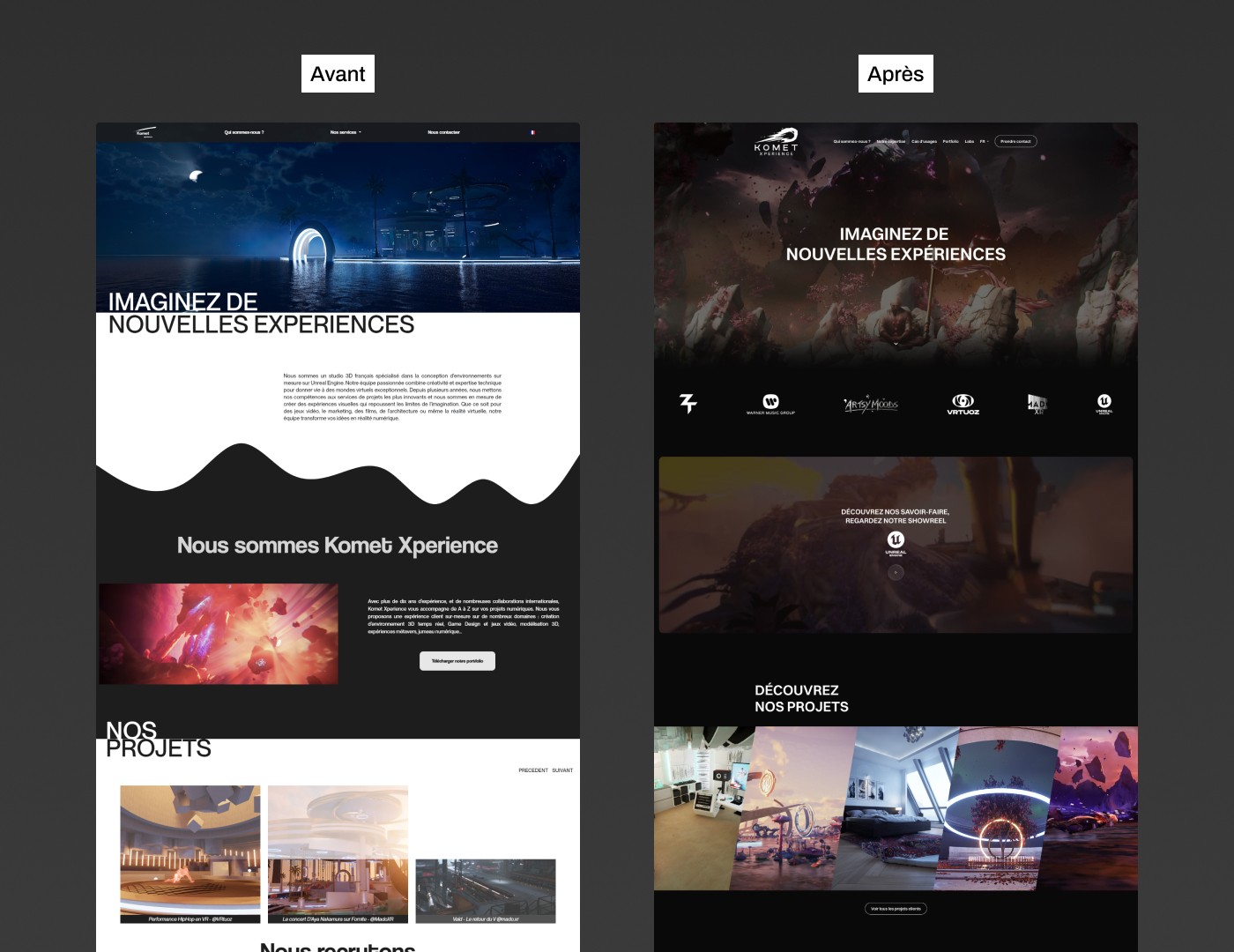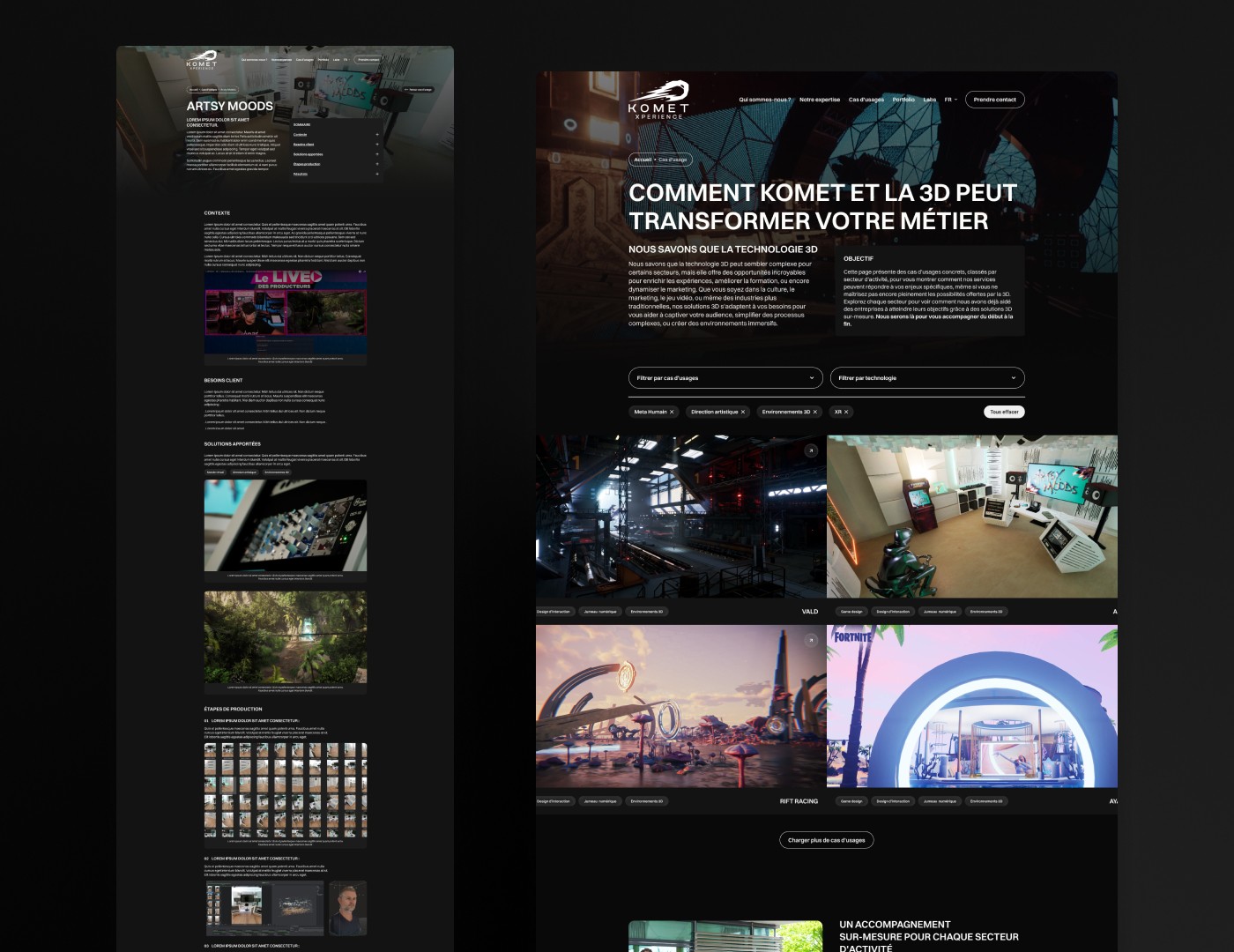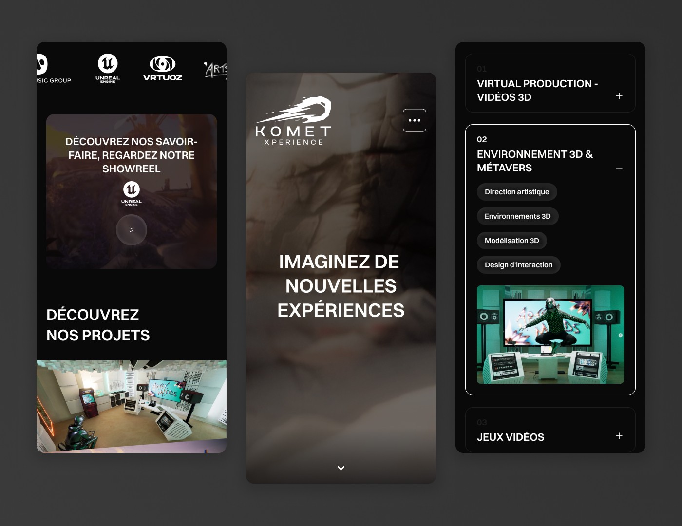 L’agence WebtribeStudio m’a confié la mission de repenser la direction artistique globale et le site internet de Komet Expérience, un studio bordelais spécialisé dans la 3D. Cette refonte s’inscrivait dans le cadre de leur participation au Web Summit à Lisbonne en 2024, un événement dédié aux enjeux auxquels la 3D interactive peut apporter des solutions. Cette occasion était parfaite pour créer une identité visuelle à la hauteur de leurs projets et de leur expertise