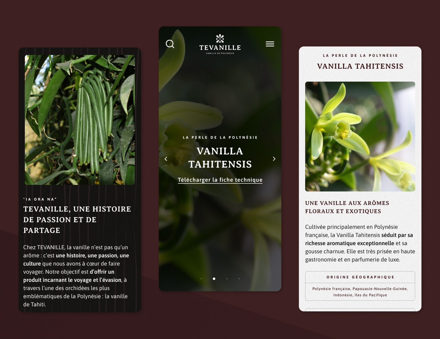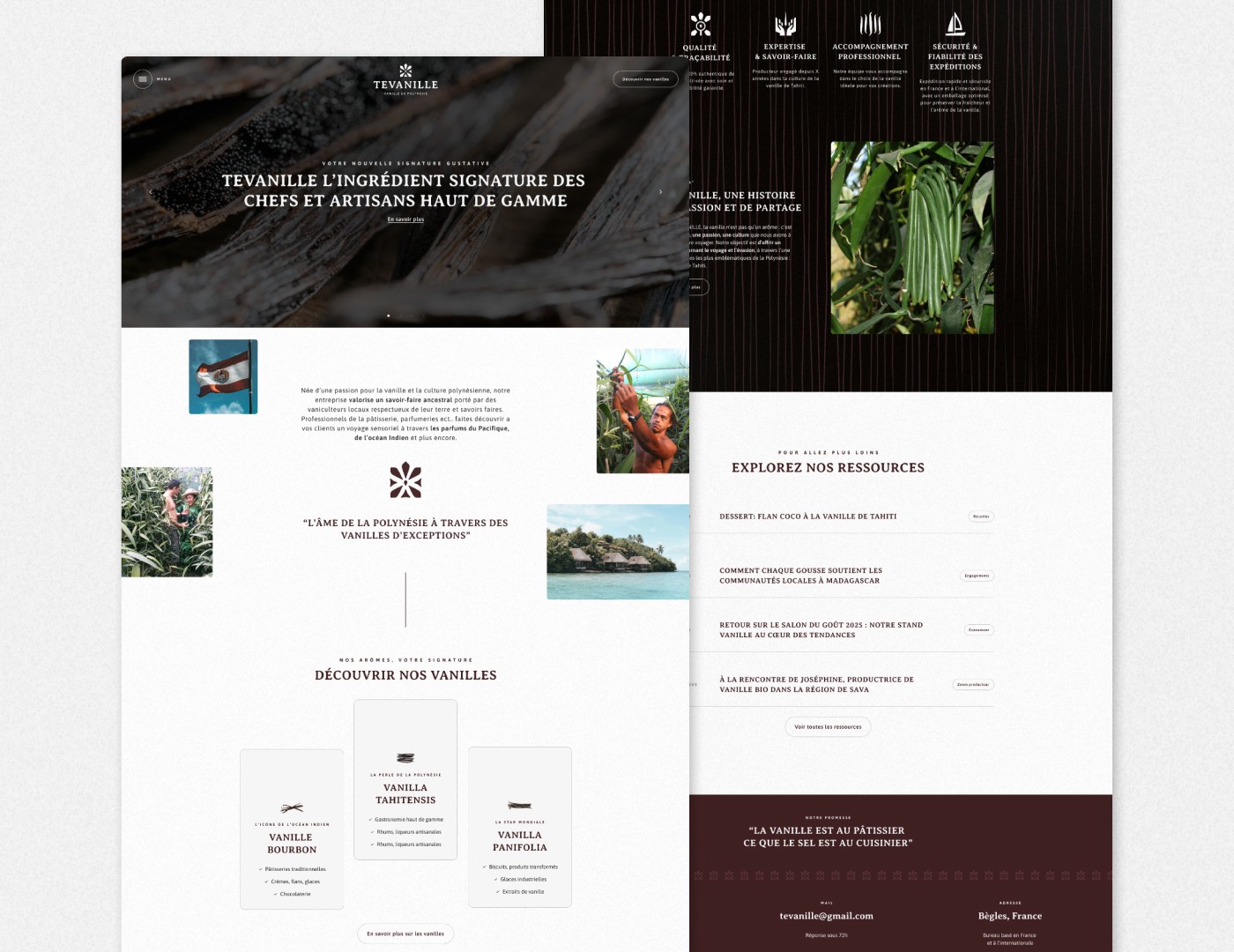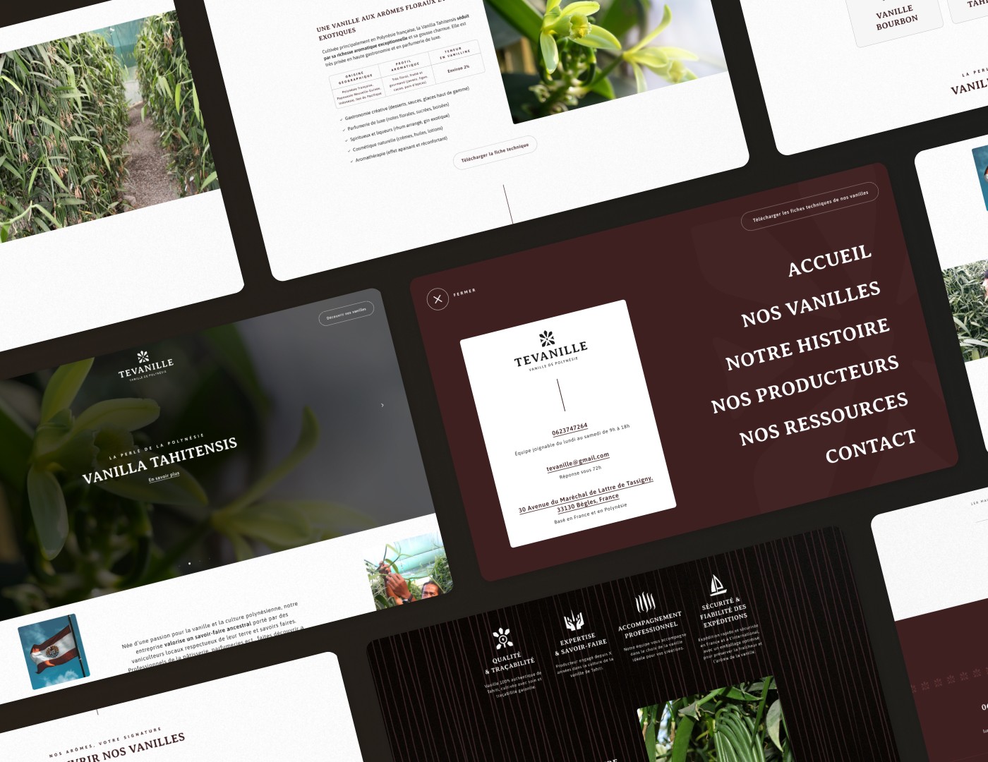 Pour son lancement, le revendeur de vanille Tevanille a fait appel à l’agence avec laquelle je collabore pour créer son image de marque. J’ai conçu l’identité visuelle et le design de son site vitrine, développant une image premium, authentique et fidèle à la culture polynésienne, berceau de ses principaux fournisseurs. Le site valorise les vanilles, leur esprit ainsi que les saveurs uniques de la Polynésie
