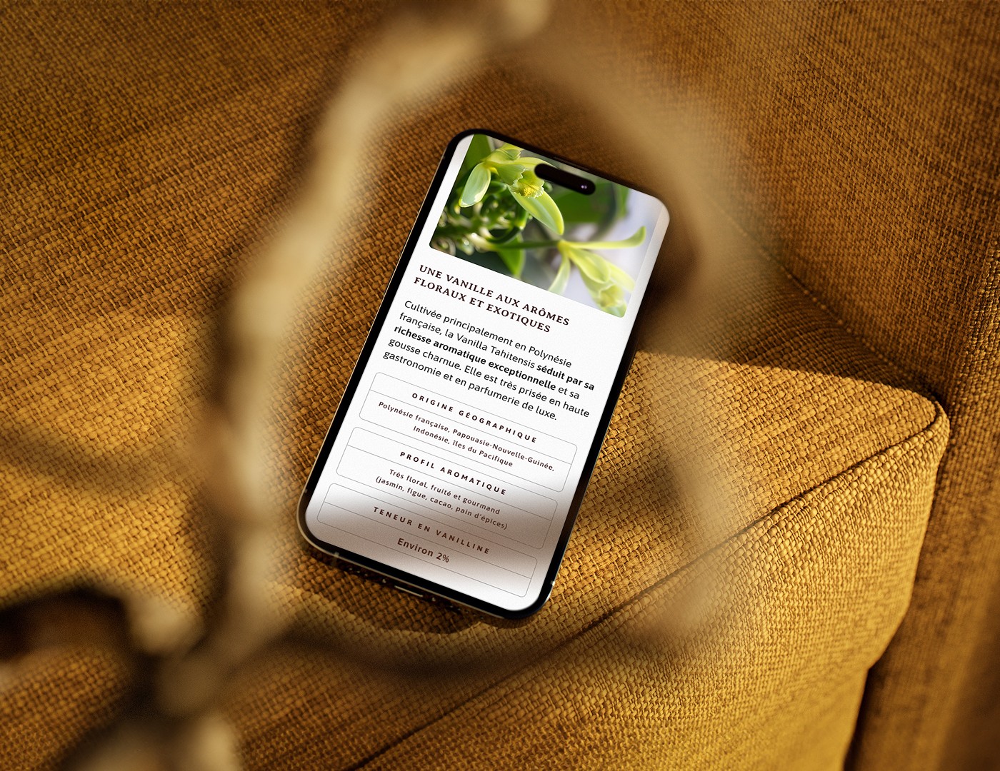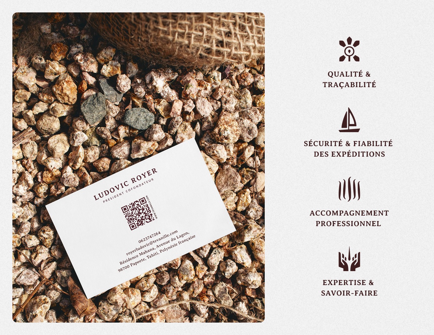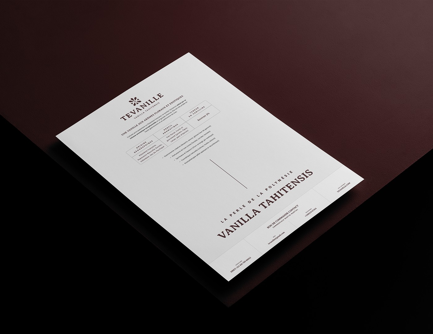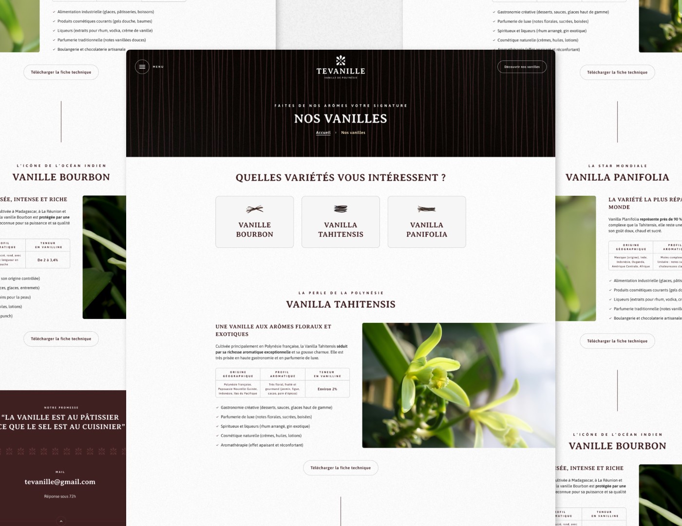 Pour son lancement, le revendeur de vanille Tevanille a fait appel à l’agence avec laquelle je collabore pour créer son image de marque. J’ai conçu l’identité visuelle et le design de son site vitrine, développant une image premium, authentique et fidèle à la culture polynésienne, berceau de ses principaux fournisseurs. Le site valorise les vanilles, leur esprit ainsi que les saveurs uniques de la Polynésie